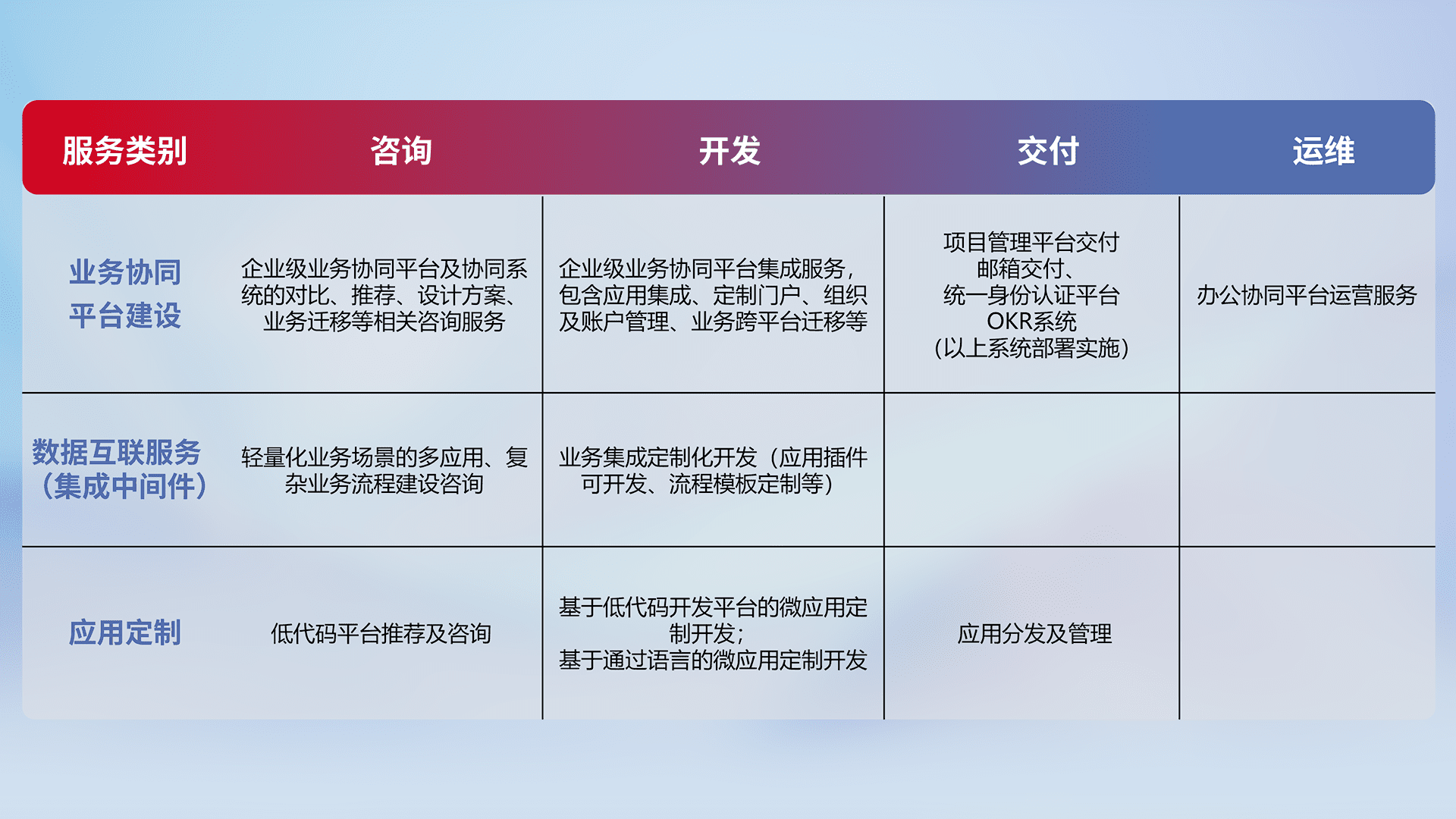 针对钉钉、、企微、、IDaas等平台级产品提供产品的规划、、、、方案、、、、交付、、、定制化开发等服务,,实现如统一协同办公、、智能客户服务、、、、混合会议管理、、智能数据查询、、、、等业务场景,,,实现数字化转型。。。。