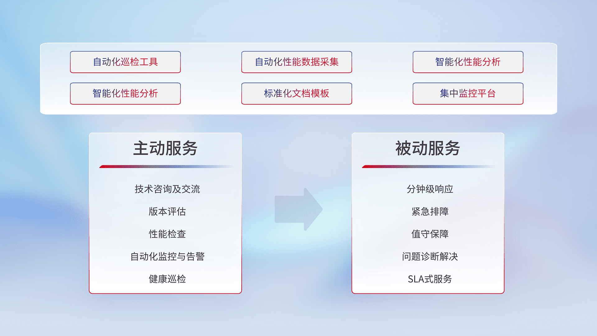 智能化工具和标准化文档,,,,保障服务质量,,,,提供主动服务(包含技术咨询、、、、版本评估、、性能检查、、、自动化监控与告警、、、健康巡检)和被动服务包含(分钟级响应、、紧急排障、、、、值守保障、、问题诊断解决、、、SLA服务)。。。